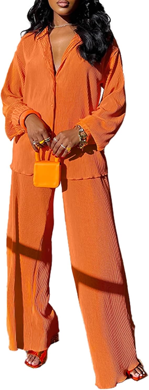 Casual 2 Piece Outfit for Women - Linen Long Sleeve Button Down Shirt + Flare Pleated Wide Leg Pants Sets Streetwear