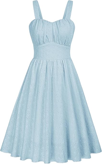 Women's Vintage Sleeveless Solid Ruched Summer Cotton Embroidery Cute A-Line Flowy Swing Midi Dress