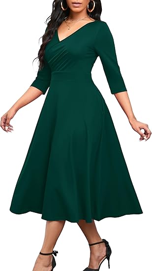 Women's Casual Wrap Flared Midi Dress Wedding Guest Cocktail Tea Dresses A-Line Swing V-Neck 3/4 Sleeve