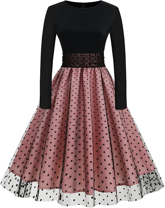 Womens 1950s Vintage Cocktail Party Dress Long Sleeve Polka Dots Mesh Retro Rockabilly Swing Dresses Fall Dress