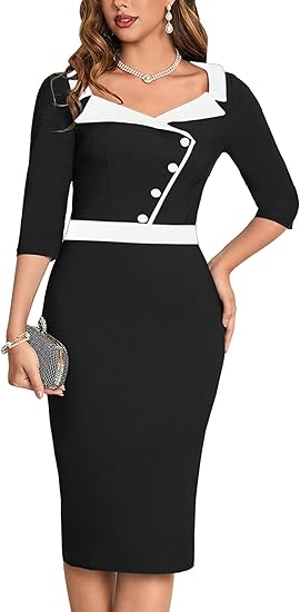 Women's 1950s 3/4 Sleeve Pencil V Neck Midi Knee Length Bodycon Vintage Cocktail Dresses