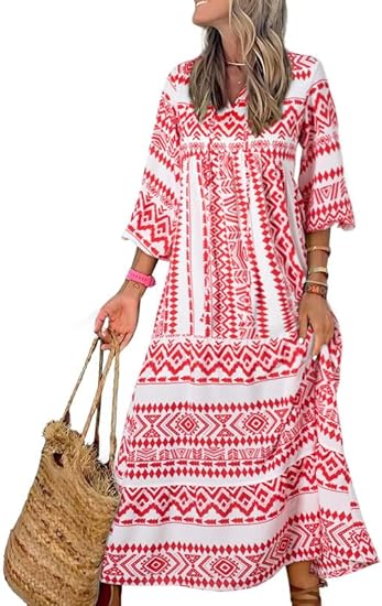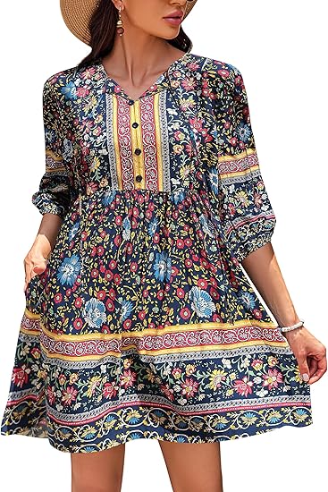 Women's Summer Boho Dress with Pockets Casual Loose Vintage Floral Swing 3/4 Sleeve V Neck Tunic Dresses