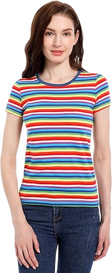 Rainbow Striped T Shirts Women Crew Neck Short Sleeve Colorful Stripes Tee Tops Casual