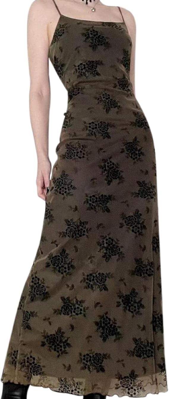 Women Vintage Floral Print Spaghetti Strap Maxi Dress Dark Gothic Sheer Mesh Sleeveless Bodycon Dresses for Party Club