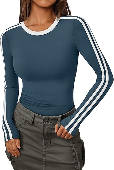 Women's Long Sleeve Y2K Fitted Shirts Color Block 2024 Trendy Crop Tops Workout Cute Outfits