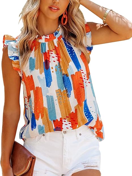 Women Summer Ruffle Trim Neckline Tank Tops Double Lined Chiffon Blouses
