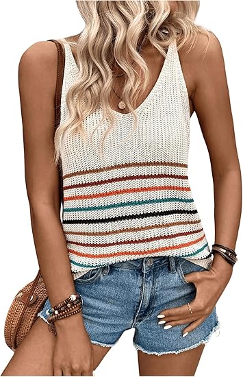 Women's Colorful Striped V Neck Knitted Cami Tops Sleeveless Spaghetti Strap Tank Tops