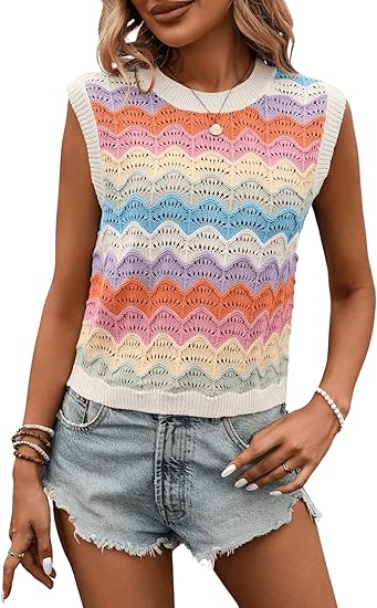 Women's Colorful Striped Round Neck Sweater Vests Sleeveless Hollow Out Casual Knitted Tank Top